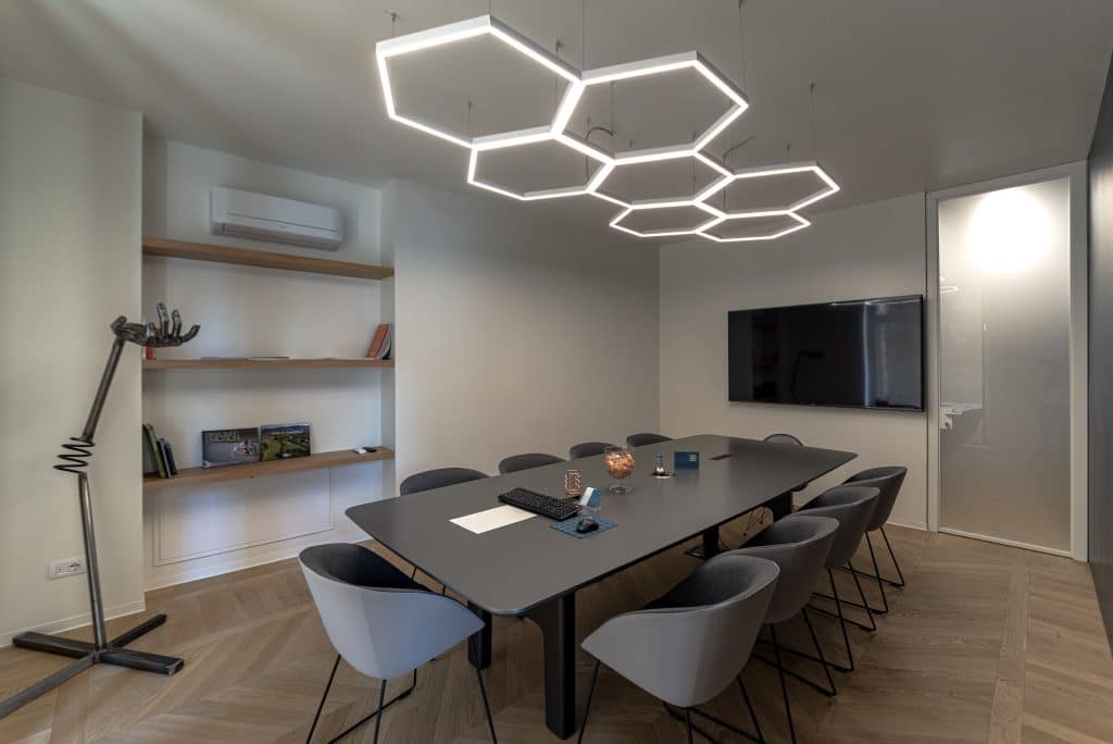 Modular system composed of painted extruded aluminum profiles, for suspension and wall installation, available in predefined or customized lengths for direct diffused and double emission lighting. To be integrated with LED linear sources, closing heads with Light Proof system, diffusing screen in opal silicone, suspension cables and canopy. IP44.